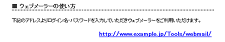 「下記のアドレスよりログイン名・パスワードを入力していただきウェブメーラーをご利用いただけます。」の下にあるアドレス(http://www.お客様ドメイン名/Tools/webmail)をクリックします。